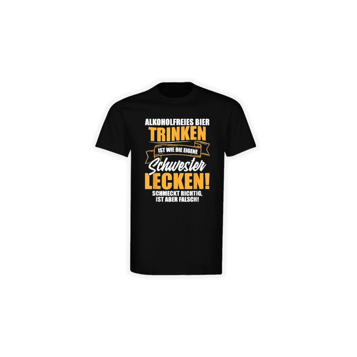 Vorderseite bedruckt mit dem Logo "ALKOHOLFREIES BIER TRINKEN IST WIE DIE EIGENE SCHWESTER LECKEN! SCHMECKT RICHTIG, IST ABER FALSCH!".